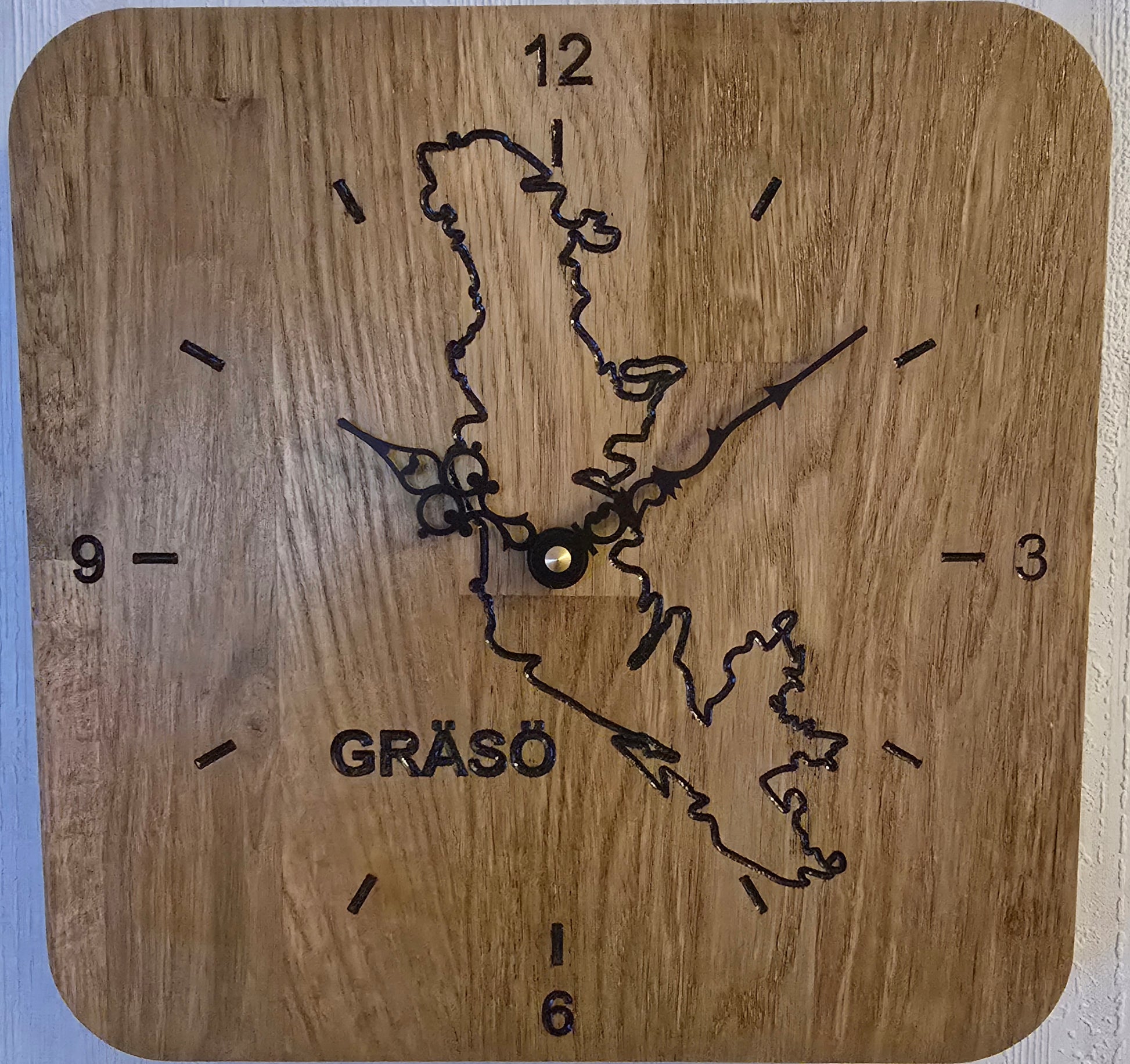 Motiv av konturerna av Gräsö utanför upplandskusten. Tillverkad i stavlimmad ek. Klarlackad. med quartz urverk. 1st AA batteri (ingår ej)