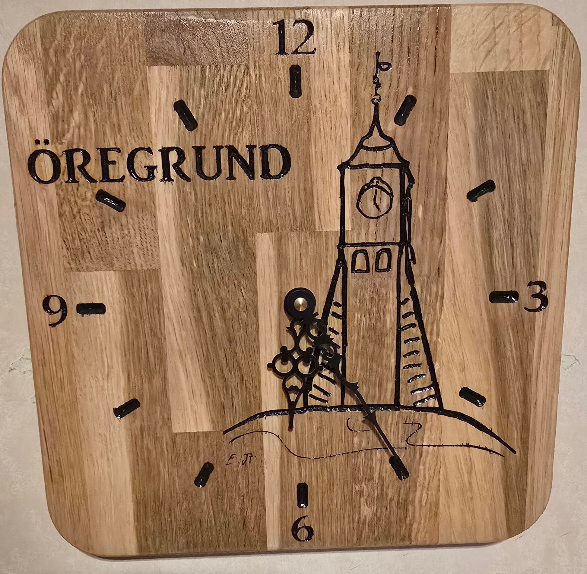 Motiv av konturerna av klockstapeln i Öregrund, stiliserad av Emanuel Jarl-Holm. Tillverkad i stavlimmad ek. Klarlackad. med quartz urverk. 1st AA batteri (ingår ej)